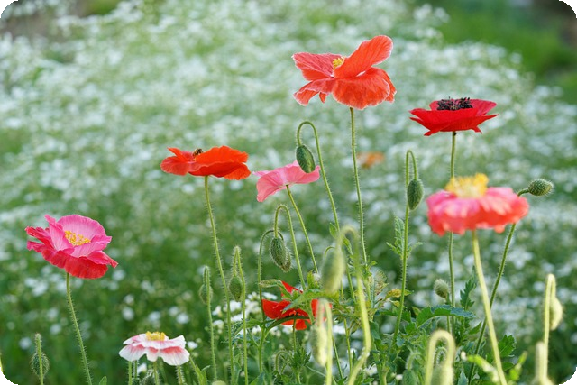 양귀비는 몽골의 초원처럼 부드러운 붉은빛으로 둑방을 물들여 놓으며, 주변의 튤립, 꽃잔디, 신비로운 안개초와 함께 환상적인 풍경을 조성합니다.