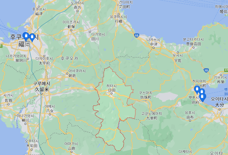 히타는 후쿠오카와 벳푸의 중간 위치라 생각하시면 됩니다.