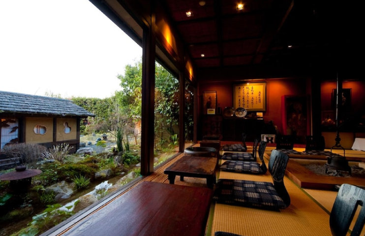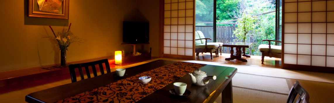 유후인 마을중심에서 떨어진 한적한 고지대에 있는 약1500평 부지에 위치한 은둔처 료칸 유후인 숲으로 둘러싸인 부지내에는 전통과 모던한 구조로 커다란 이로리나 바가 마치 별장같은 공간을 연출하고 있습니다.