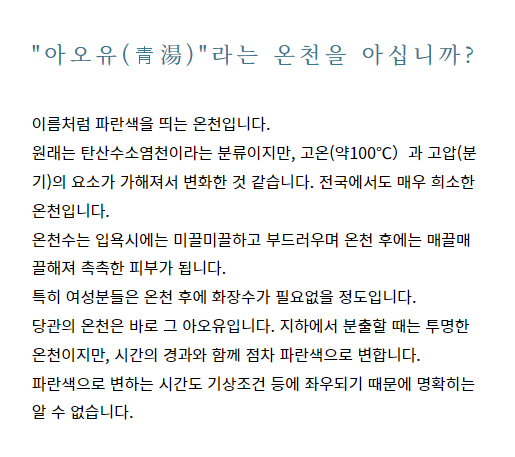 전국적으로도 보기드문 선명한 코발트블루와 매끌매끌 촉촉한 천질이 특징인 천연온천 "아오유"가 당관의 자랑입니다.